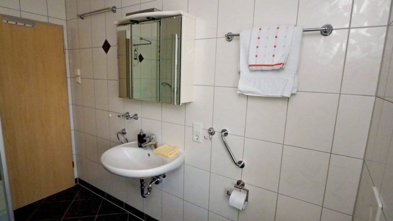 Hier steht Ihnen ein Waschbecken mit dreiteiligem Spiegelschrank, ein WC mit Haltegriff, eine geräumige Dusche mit eingebauter Sitzbank & Haltegriff zur Verfügung. Ein Fön, Kosmetikspiegel und ausreichend Handtücher liegen ebenfalls für Sie bereit.