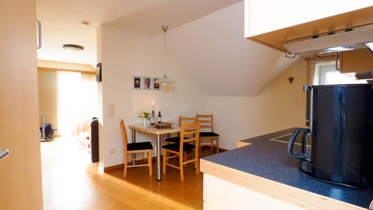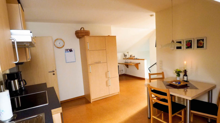 Modern, freundlich und komplett ausgestattet. Wir bieten Ihnen neben Kühlschrank inkl. Gefrierfachen, Backofen und Ceranfeld zur Nutzung an. Außerdem gehören eine Mikrowelle, ein Toaster, Wasserkocher, Stabmixer, Kaffeemaschine, Geschirrspülmaschine und einen Eierkocher zur Ausstatung der Ferienwohnung. Viele Kleinigkeiten ergänzen das Küchensortiment. So lässt sich auch schon mal schnell ein Frühstück an unseren Küchentisch zaubern.